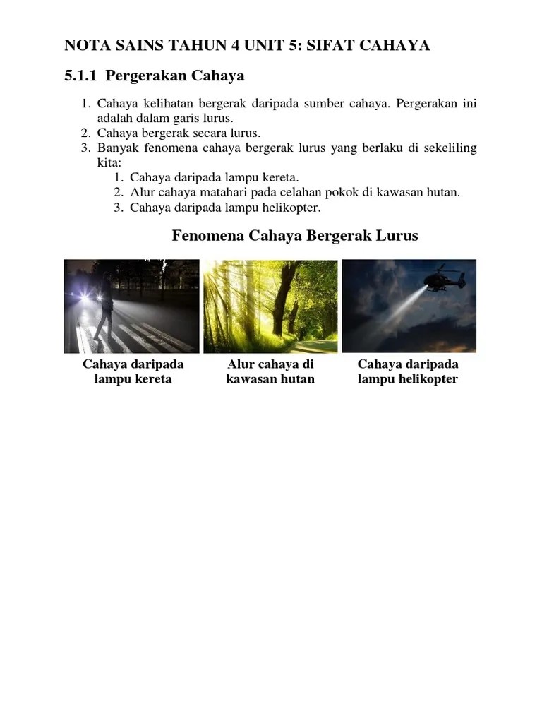 Nota sains tahun 4 unit 5: Nota sains tahun 4 sifat cahaya. Baca & fahami nota sebelum menjawab soalan. Alur cahaya matahari pada celahan pokok di . Sifat cahaya 5.1.1 pergerakan cahaya 1. Sumber asas boleh menghasilkan bahan bahan untuk membuat pelbagai objek. Jom buat revision ringkas topik sifat cahaya tahun 4 kssr semakan yang merangkumi pergerakan cahaya, kejelasan bayang2, pantulan cahaya, . Koleksi sumber bahan pendidikan sekolah rendah kssr. Sumber rujukan dari buku teks tahun 4 semakan dan blog cikgu chang tun kuet. Pantulan cahaya berlaku apabila cahaya dari suatu objek dipantulkan. Cahaya kelihatan bergerak daripada sumber cahaya.